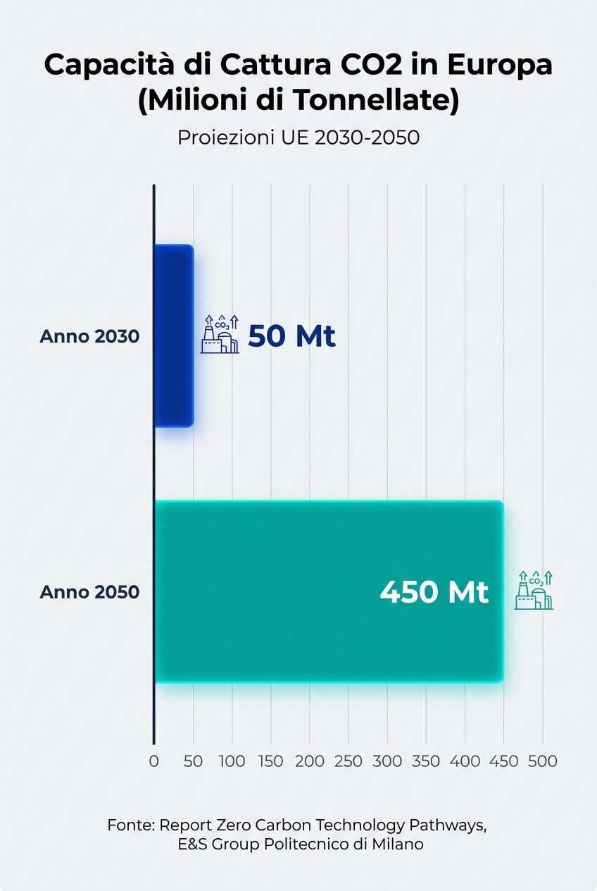 Secondo il report “Zero Carbon Technology Pathways” dell’Energy & Strategy Group del Politecnico di Milano, l'Unione Europea vedrà un aumento significativo della capacità di cattura della CO2, passando dai circa 50 milioni di tonnellate previsti nel 2030 a 450 milioni nel 2050. L'Italia si posiziona come terzo paese in UE per capacità di stoccaggio, grazie soprattutto al progetto di Ravenna, destinato a diventare un hub strategico per il Mediterraneo.[Infobuild Energia]